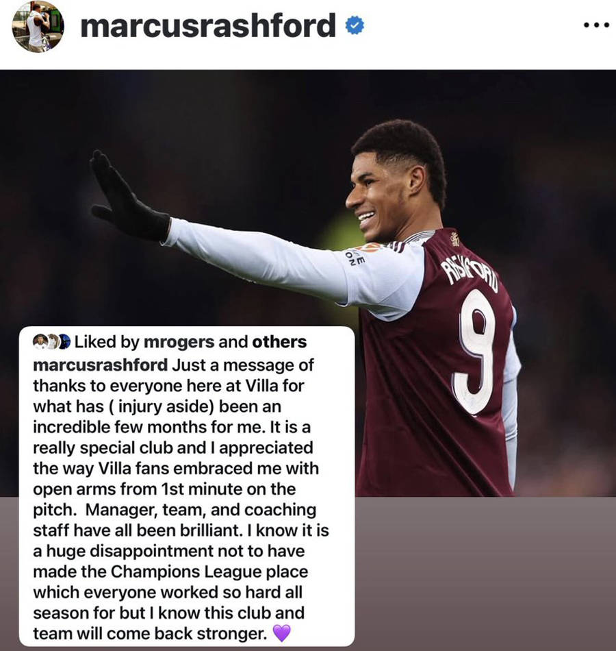 据说拉什福德在维拉过得很愉快,在经历了在曼联的低谷后,他重新找回了对足球的激情,本赛季他打入了4球并助攻6次,成功重返图赫尔执教的英格兰队。但是,这并不意味着他会降低对下赛季加盟欧冠球队的要求。他在周一正式告别维拉公园时表示:“这是一家特别的俱乐部,我很感激维拉球迷对我的拥抱。无缘欧冠是一个巨大的失望,尽管每个人在这个赛季都付出了努力,但我相信俱乐部和球队会变得更加强大。”