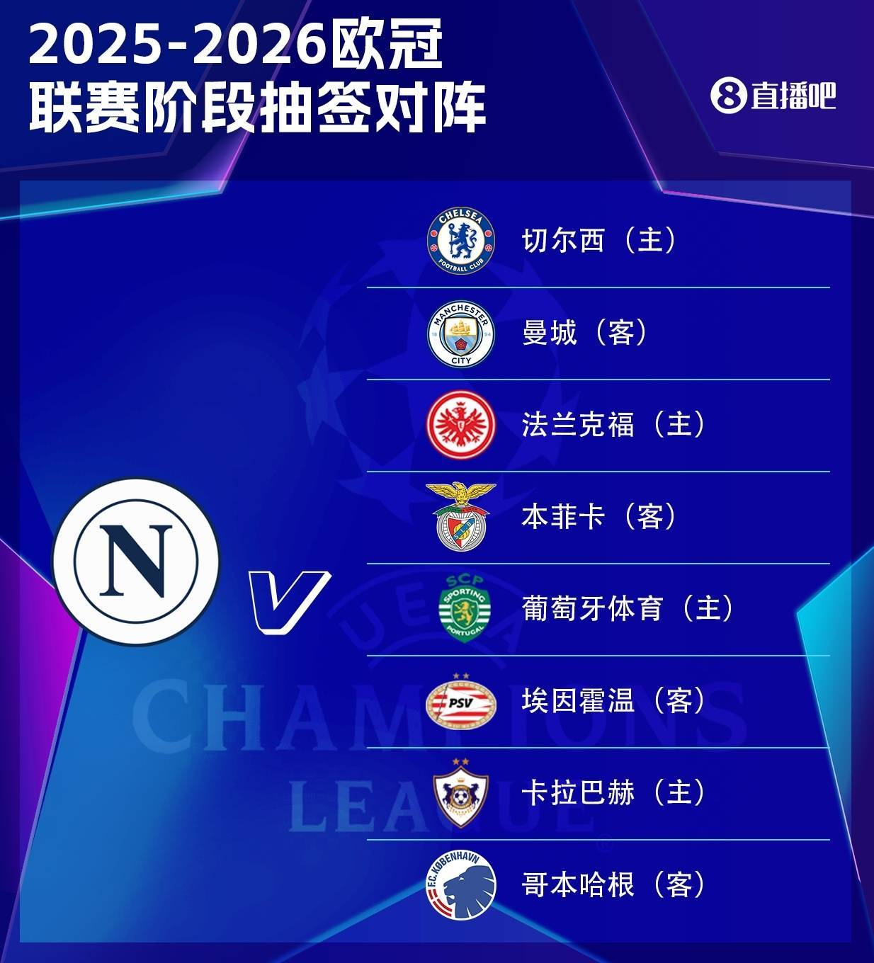 好签!那不勒斯欧冠赛程:开局战曼城收官对切尔西,第4轮对法鹰