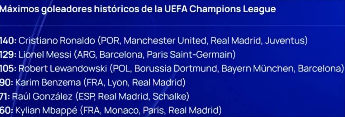 对姆巴佩来说,要成为欧冠射手王,难度则更大。在欧冠历史射手榜上,C罗以140球排名榜首,梅西(129球)、莱万(105球)、本泽马(90球)以及劳尔(71球)分居其后,姆巴佩则以60球排名第6位。
